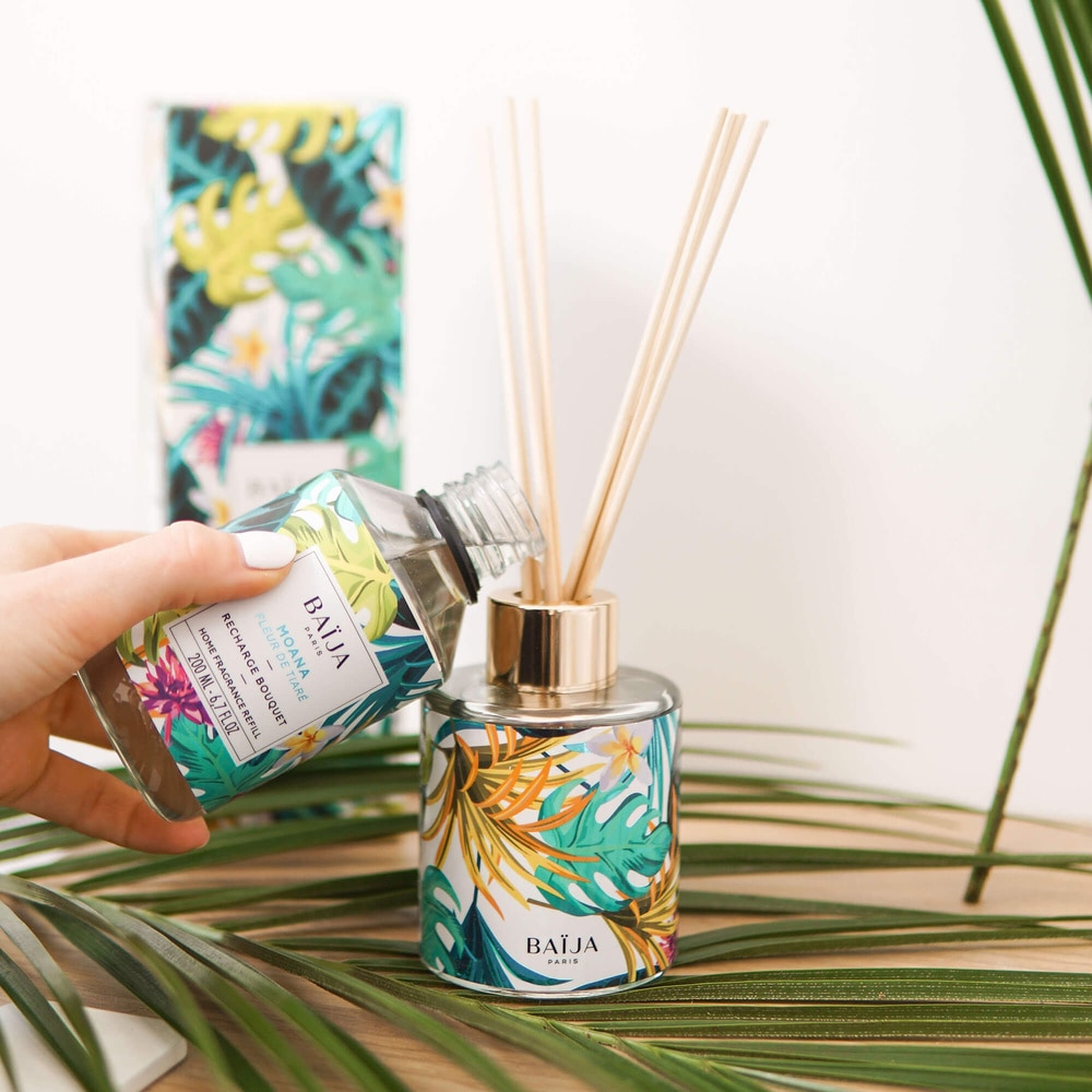 Ce bouquet parfumé Moana (100ml) fabriqué aux Andelys en normandie diffuse subtilement ses effluves ensoleillées grâce à des fragrances sélectionnés auprès de parfumeurs de Grasse.