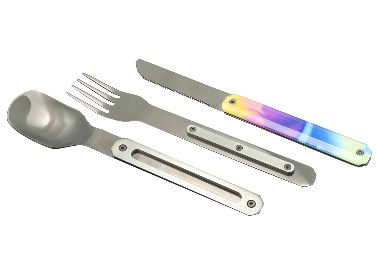 Couverts en acier inoxydable martensitique 2CR14, finition poli miroir. Composé d’une grande cuillère, d’une fourchette 4 dents et d’un couteau à lame micro dentée. Manche en Olivier. Assemblage aimanté.